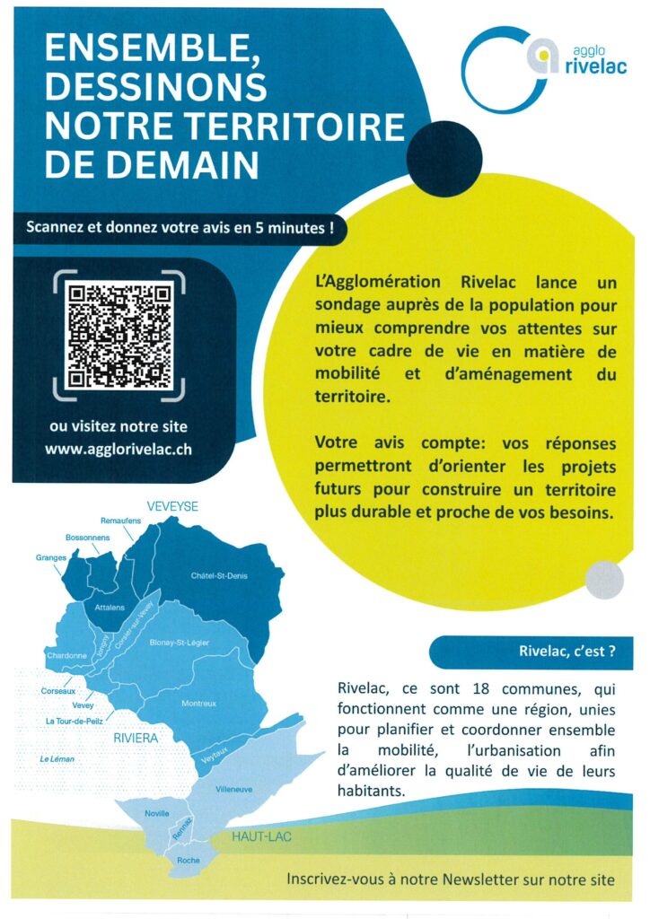 L’Agglomération Rivelac lance un sondage auprès de la population pour mieux comprendre vos attentes sur votre cadre de vie en matière de mobilité et d’aménagement du territoire.