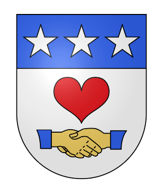 Les armoiries de Corsier-sur-Vevey en science héraldique : « D’argent au coeur de gueules soutenu d’une foi de carnation, parée d’azur, au chef d’azur chargé de trois étoiles d’argent ».